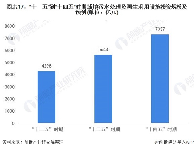 根據(jù)“十三五”規(guī)劃中針對水環(huán)境治理領(lǐng)域的投資規(guī)模,同時結(jié)合新時期的農(nóng)村水環(huán)境治理與幾大流域生態(tài)治理的工程總量與復(fù)雜程度綜合分析,前瞻判斷“十四五”規(guī)劃中針對水環(huán)境治理的投資規(guī)?;蜻M一步升級加碼至7337億元。中國污水處理市場仍有較大發(fā)展空間。