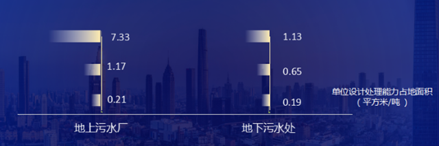 空間高效利用上,目前還是以地下水廠為主。入圍的污水廠平均單位設(shè)計規(guī)模占地面積為1.1平方米/噸,而地下污水處的平均單位占地面積為0.53平方米/噸。地上空間的利用主要途徑是辦公場所、停車場、公園等公共區(qū)域,地下空間利用主要是辦公、展覽展示等。