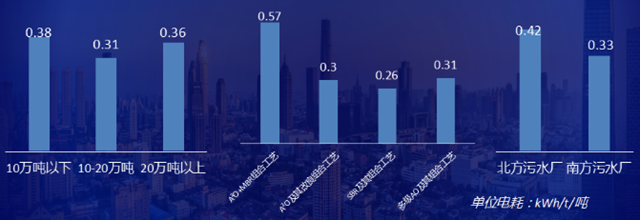 低碳化方面比選出3個細分榜單,8座污水廠入圍,上榜5座。城市污水廠正由節(jié)能降耗向綠色低碳循環(huán)、系統(tǒng)融合的方向轉(zhuǎn)型,但目前行業(yè)低碳化才剛剛起步。入圍的64座污水廠中最低單噸電耗達到0.12kWh/噸,最高單噸電耗0.69kWh/噸,而地下污水廠和地上污水廠的單位運營電耗差距較大,其中,地下污水廠平均電耗0.73kWh/噸。(剔除可再生能源利用及污泥處置發(fā)電耗電等外部電耗,剔除地下污水廠提升排放、通風等高電耗因素影響)此外,工藝選擇及南北差異均對能耗影響明顯。