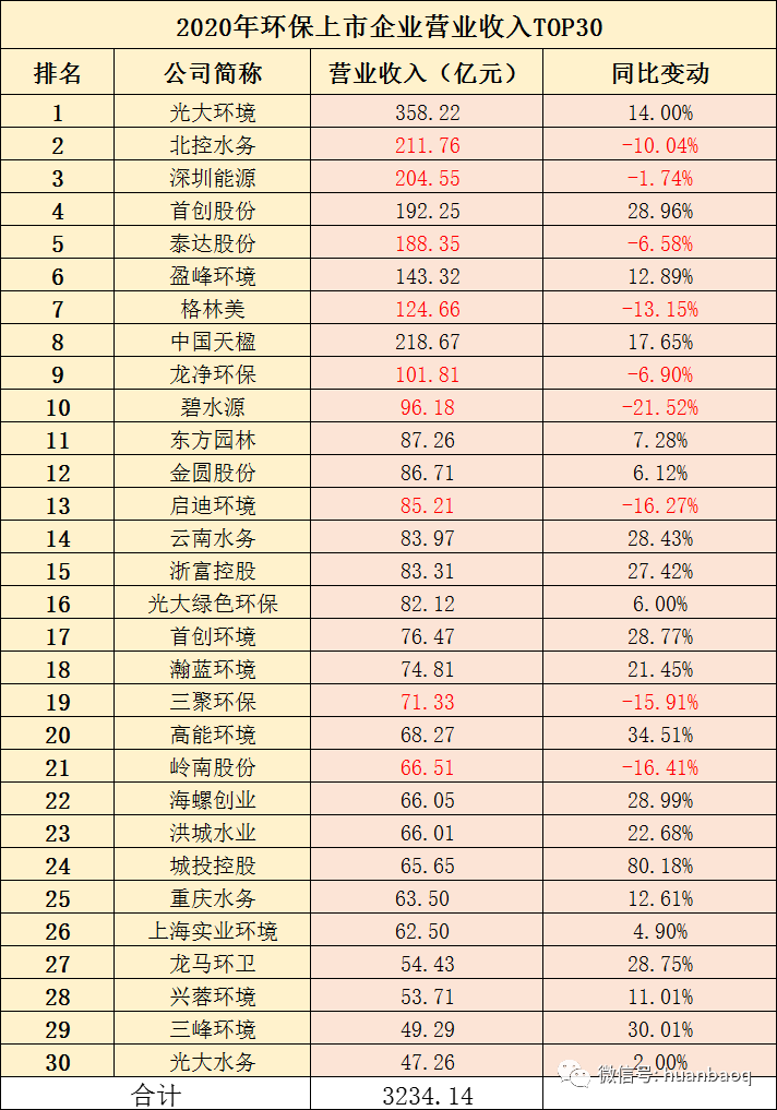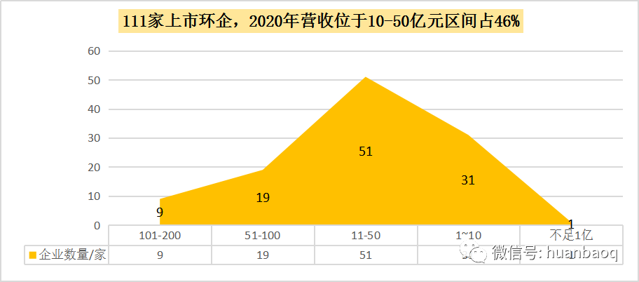 111家環(huán)保上市企業(yè),2020年?duì)I收實(shí)現(xiàn)正向增長(zhǎng)有71家,約占64%,這一比例相較于2019年下降了16%,遠(yuǎn)低于預(yù)期,再次印證了去年疫情對(duì)我國(guó)環(huán)保產(chǎn)業(yè)沖擊。從營(yíng)收分布區(qū)間來看,111家上市環(huán)企中,突破百億大關(guān)的有9家,分別是光大環(huán)境(358.22億元,14%)、北控水務(wù)(211.76億元,-10.04%)、深圳能源(204.55億元,-1.74%)、首創(chuàng)股份(192.25億元,28.96%)、泰達(dá)股份(188.35億元,-6.58%)、盈峰環(huán)境(143.32億元,12.89%)、格林美(124.66億元,-13.15%)、中國(guó)天楹(218.67億元,17.65%)、龍凈環(huán)保(101.81億元,-6.9%)。9家百億級(jí)的環(huán)保上市企業(yè)中,只有光大環(huán)境、首創(chuàng)股份、盈峰環(huán)境、中國(guó)天楹4家禁受住了疫情的壓力,2020年?duì)I業(yè)收入實(shí)現(xiàn)同比上升,其余5家較上年度都在下滑。而三聚環(huán)保、碧水源和啟迪環(huán)境,曾經(jīng)在2018年-2019年間營(yíng)收突破百億,一場(chǎng)疫情過后,2020年又從百億營(yíng)收陣營(yíng)中“出局”了。111家上市環(huán)企,2020年?duì)I收在51億元-100億元區(qū)間有19家,龍馬環(huán)衛(wèi)、興蓉環(huán)境首次擠進(jìn)50億元營(yíng)收陣營(yíng);而營(yíng)收在10億元-50億元區(qū)間的上市環(huán)企,有51家,約占半數(shù);營(yíng)收區(qū)間位于1億元-10億元的“小而美”上市環(huán)企,有31家,它們大多是科創(chuàng)板企業(yè)(如圖三所示)。圖三:111家上市環(huán)企,2020年?duì)I收分布區(qū)間圖經(jīng)過2018年的產(chǎn)業(yè)寒冬,2019年的民企易主國(guó)資混改熱潮,2020年的新冠肺炎疫情沖擊,現(xiàn)如今,我國(guó)環(huán)保產(chǎn)業(yè)間的兼并重組洗牌階段已接近尾聲。從每年?duì)I收TOP30強(qiáng)上市環(huán)企排名中,就能窺探一二(如圖四所示)。有的企業(yè)一直穩(wěn)居行業(yè)前幾,比如光大環(huán)境、北控水務(wù)、盈峰環(huán)境;有的企業(yè)一直在走上坡路,排名不停地向前,比如業(yè)績(jī)一直保持穩(wěn)健增長(zhǎng)的首創(chuàng)股份、首創(chuàng)環(huán)境,高能環(huán)境、瀚藍(lán)環(huán)境、海螺創(chuàng)業(yè)、龍馬環(huán)衛(wèi)、興蓉環(huán)境;還有的企業(yè),在這輪“你追我趕”激烈競(jìng)爭(zhēng)中,沒跟著節(jié)奏發(fā)展趨于緩慢,比如上文提到碧水源、三聚環(huán)保、啟迪環(huán)境。有人進(jìn),有人退,任何商業(yè)游戲均是如此。被PPP折斷雙翼的上市民企退了,大型央企來了,地方國(guó)資進(jìn)駐了,我國(guó)環(huán)保產(chǎn)業(yè)競(jìng)爭(zhēng)格局早已不是從前的樣子了。圖四:2020年環(huán)保上市企業(yè)營(yíng)業(yè)收入TOP30營(yíng)收增速:雅居樂排名第三,偉明環(huán)保連續(xù)9連增