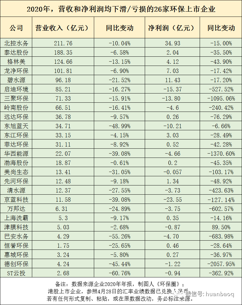 早在3月初,《環(huán)保圈》就已經(jīng)對(duì)55家環(huán)保上市企業(yè)的2020年業(yè)績(jī)預(yù)告進(jìn)行了統(tǒng)計(jì)分析,結(jié)果發(fā)現(xiàn),55家企業(yè)中,有6成企業(yè)2020年歸母凈利潤(rùn)實(shí)現(xiàn)正增長(zhǎng),4成企業(yè)表現(xiàn)不理想,歸母凈利潤(rùn)負(fù)增長(zhǎng),甚至虧損。如果將55家環(huán)保上市企業(yè)范圍擴(kuò)大2倍,增加到111家,總體情況是否會(huì)發(fā)生變化呢?據(jù)《環(huán)保圈》繼續(xù)跟蹤統(tǒng)計(jì),截止到5月6日,A股/港股已有111家環(huán)保上市企業(yè)如期完成了2020年年報(bào)的披露工作(業(yè)績(jī)?nèi)珗D附文末),這些上市企業(yè)業(yè)務(wù)涉及環(huán)境監(jiān)測(cè)、生態(tài)修復(fù)、垃圾焚燒、環(huán)衛(wèi)、危險(xiǎn)廢物、污水處理、供水等各個(gè)環(huán)保細(xì)分板塊,基本可以說明環(huán)保行業(yè)的整體情況。總體來看,111家上市環(huán)企中,約有6成企業(yè)2020年?duì)I業(yè)收入和歸母凈利潤(rùn)均實(shí)現(xiàn)正向增長(zhǎng),4成的企業(yè)要么是營(yíng)收下滑,要么是歸母凈利潤(rùn)虧損。圖一:111家環(huán)保上市企業(yè),2020年凈利潤(rùn)出現(xiàn)下滑/虧損占40%進(jìn)一步觀察,營(yíng)收和凈利潤(rùn)表現(xiàn)均差的26家上市環(huán)企,不乏有排名非??壳暗募?xì)分領(lǐng)域的龍頭,如北控水務(wù)、格林美、碧水源、啟迪環(huán)境、東江環(huán)保等。去年業(yè)績(jī)罕見出現(xiàn)大“變臉”,足以說明了2020年,在國(guó)內(nèi)外疫情的沖擊下,即便是細(xì)分領(lǐng)域的優(yōu)秀老兵,也有“馬失前蹄”的時(shí)候,好的不好,差的更差,掘金綠水青山比想象中的要難(如圖二所示)!圖二:2020年,營(yíng)收和凈利潤(rùn)均下滑/虧損的26家環(huán)保上市企業(yè)營(yíng)收榜:光大環(huán)境穩(wěn)居第一,百億企業(yè)3家“掉隊(duì)”