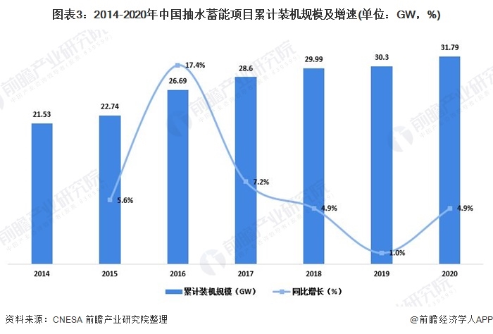 截至2020年底,我國(guó)抽水蓄能的累計(jì)裝機(jī)規(guī)模達(dá)到31.79GW,同比增長(zhǎng)4.9%。因抽水蓄能相對(duì)其他儲(chǔ)能方式成本較低,短期看來,其在儲(chǔ)能應(yīng)用中的主導(dǎo)地位不會(huì)被動(dòng)搖。