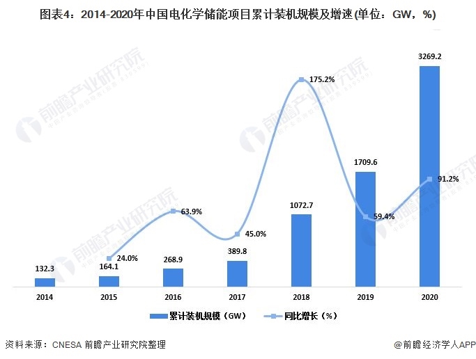 截至2020年底,電化學(xué)儲(chǔ)能累計(jì)裝機(jī)規(guī)模為3269.2MW,同比增長(zhǎng)91.2%。未來五年,隨著分布式光伏、分散式風(fēng)電等分布式能源的大規(guī)模推廣,電化學(xué)儲(chǔ)能行業(yè)將面臨更廣闊的市場(chǎng)機(jī)遇。
