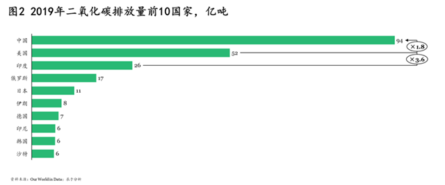 我國于2007年超過美國,成為二氧化碳排放第一大國,2019年二氧化碳排放量94億噸,遠(yuǎn)高于同期美國的52億噸和印度的26億噸(如圖2)。