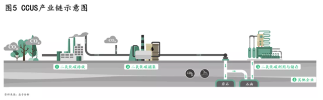 CCUS(碳捕集利用與封存技術(shù)),被認(rèn)為是最具潛力的前沿減排技術(shù)之一(見圖5)。聯(lián)合國政府間氣候變化專門委員會(huì)(IPCC)第五次評(píng)估報(bào)告指出:如果沒有CCUS,絕大多數(shù)氣候模式都不能實(shí)現(xiàn)減排目標(biāo)。更為關(guān)鍵的是,沒有CCUS技術(shù),減排成本將會(huì)成倍增加,估計(jì)增幅平均高達(dá)138%。