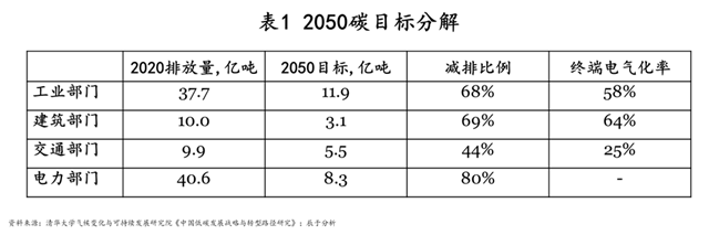 將30·60目標(biāo)按部門進(jìn)行分解可以看到,到2050年工業(yè)部門需減排68%、終端電氣化率58%,建筑部門減排69%、終端電氣化率64%,交通部門減排44%、終端電氣化率25%,而電力部門則需減排80%以上,任務(wù)艱巨(見表1)。
