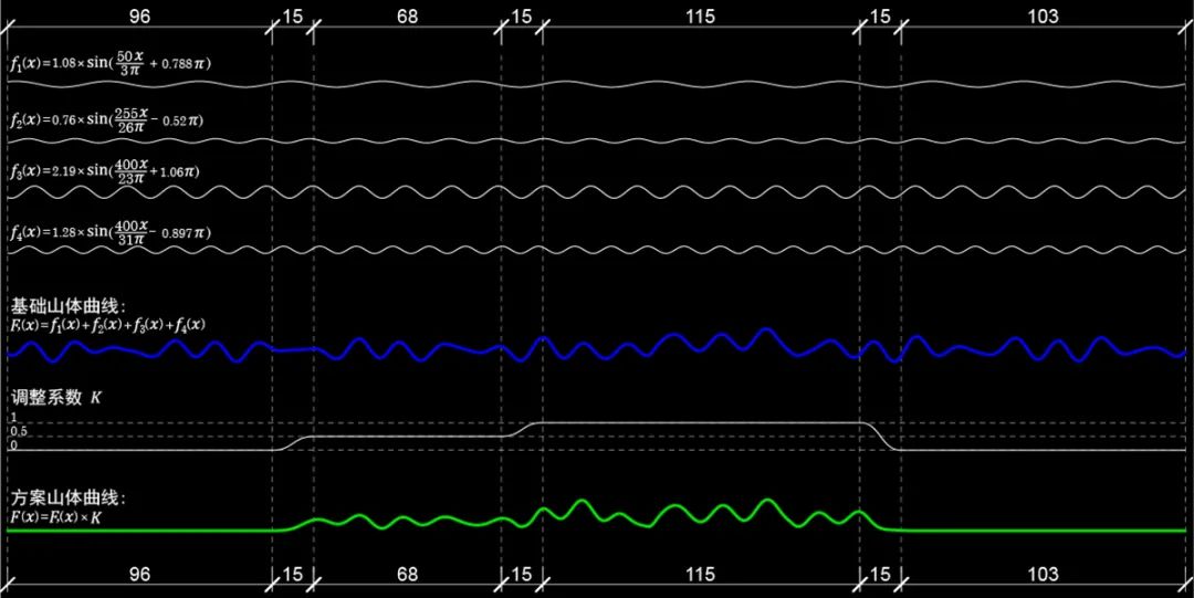 峰叢形態(tài)是由四組三角函數(shù)曲線合成得出的,通過函數(shù)控制,保證曲線的曲率變化均勻,使其具有良好的視覺形態(tài),也為后期深化工作提供了詳細(xì)的數(shù)據(jù)支持。