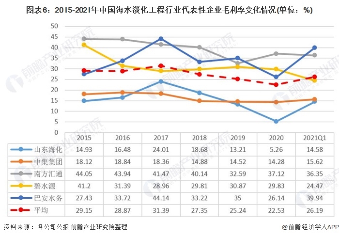 毛利率方面,中國海水淡化工程行業(yè)代表性企業(yè)中,2015-2021年一季度,南方匯通的毛利率在38%左右浮動,在代表性企業(yè)中處于較高的水平;山東?;c中集集團則一直處于平均值以下,在15%左右的水平波動。中國海水淡化工程行業(yè)代表性企業(yè)中毛利率平均水平隨時間變化不大,在27%水平附近波動。