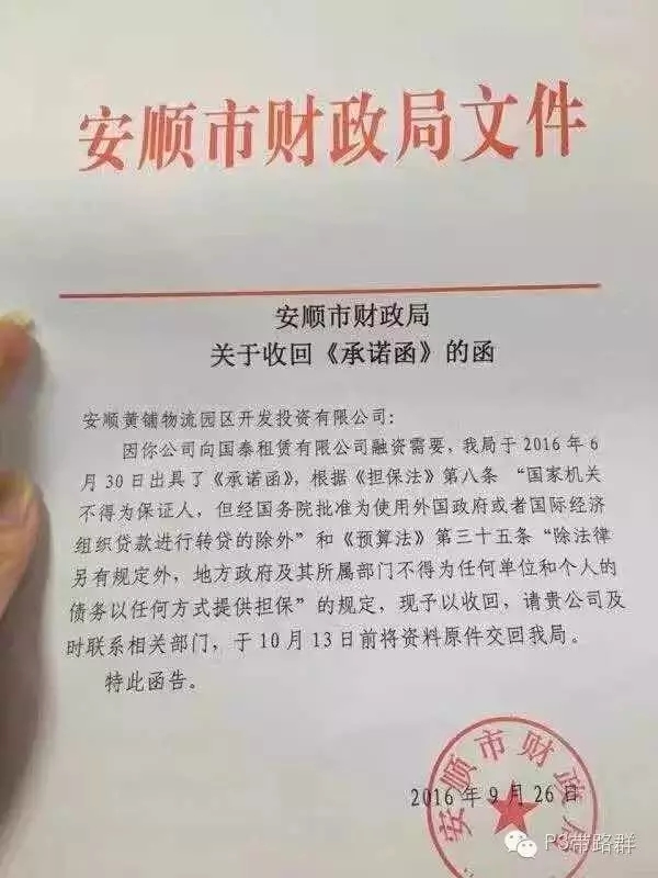2016年10月10日—11日,貴州安順、遵義等地,要將向金融機(jī)構(gòu)(主要是融資租賃、信托)提供的為融資提供支持的“承諾函”、“安排函”撤回。此消息一出,在金融機(jī)構(gòu)和PPP界掀起軒然大波:“沒有了‘承諾函’,政府融資的業(yè)務(wù)還做不做了?”“整個社會信用在這一刻瞬間崩塌”……