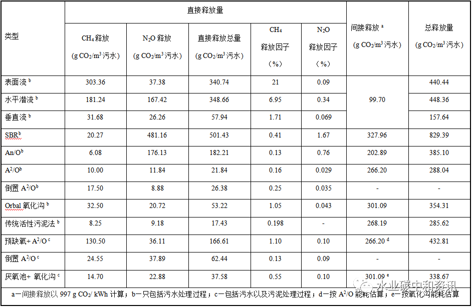 除直接釋放外,污水處理過程中GHG釋放還包括間接釋放(能源/藥耗等)。人工濕地運行能耗一般小于0.1 kWh/m3(取0.1),而An/O、A2/O、SBR、氧化溝、傳統(tǒng)活性污泥法等活性污泥工藝平均能耗分別為0.283、0.267、0.336 、0.302和0.269 kWh/m3 ??梢姡斯竦亻g接釋放量(99.7 g CO2/m3)遠(yuǎn)遠(yuǎn)小于傳統(tǒng)工藝的最小間接釋放量(An/O工藝:202.89 g CO2/m3)。即便如此,表面流和水平潛流人工濕地的GHG總釋放量(直接+間接)仍與傳統(tǒng)活性污泥法旗鼓相當(dāng),甚至更高。唯有垂直流人工濕地GHG總釋放量遠(yuǎn)低于所有活性污泥工藝。因此,在建設(shè)成本及運行狀況允許的情況下應(yīng)盡可能選用垂直流人工濕地。
