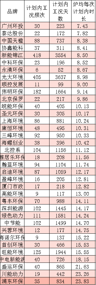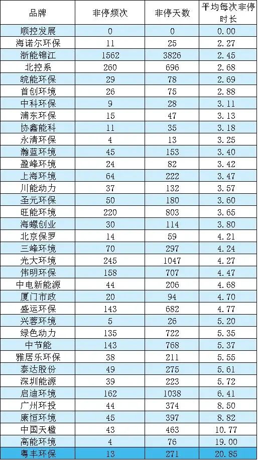 數(shù)據(jù)顯示,順控發(fā)展、粵豐環(huán)保、高能環(huán)境、興蓉環(huán)境、深能環(huán)保等五家品牌企業(yè),旗下每臺焚燒爐的非停頻次平均都小于1。
