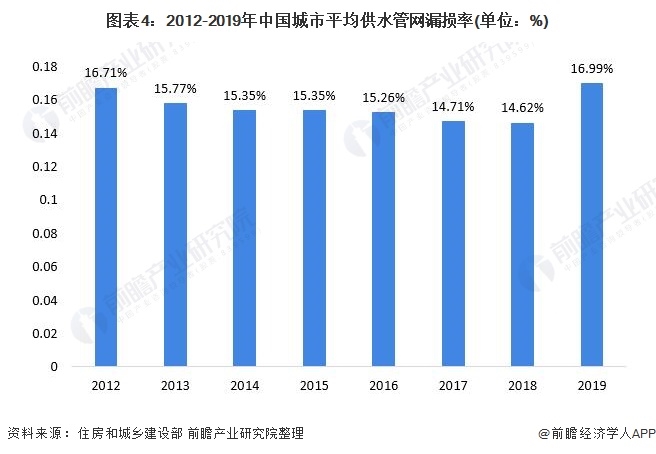 在我國水務行業(yè)市場規(guī)模的擴大的同時,我國水務行業(yè)仍存在一些痛點。例如,我國供水管網(wǎng)漏損率仍處于較高水平。2012-2018年,我國城市供水管網(wǎng)漏損率從16.71%下降至14.62%。2019年,我國供水管網(wǎng)漏損率小幅上升,增至16.99%。