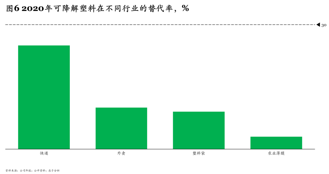 根據(jù)2020年“禁塑令”,主要限制使用的塑料制品有四類:塑料購物袋、一次性塑料餐具、賓館酒店一次性塑料用品和快遞塑料包裝,超薄塑料袋和超薄農(nóng)膜的生產(chǎn)和銷售也受到限制。目前可降解塑料在這些行業(yè)中的替代率均較低,最高為快遞行業(yè)的25%,最低為農(nóng)膜行業(yè)的3%,均低于美國、荷蘭等國家30%的平均替代率(見圖6)。