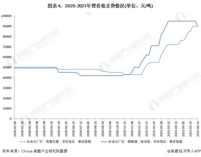 其次,前瞻認為這些企業(yè)布局的第二個原因是電池原材料的上漲。以碳酸鋰為例,碳酸鋰作為鋰電池的主要正極材料之一,自2021年年初以來,受到北方地區(qū)天氣及南方地區(qū)限電的影響,碳酸鋰的產量較低,同時新能源汽車和電動自行車下游需求拉動動力電池企業(yè)訂單火爆,造成供不應求,電池級碳酸鋰的出廠價從4.3萬元/噸增至9.5萬元/噸。