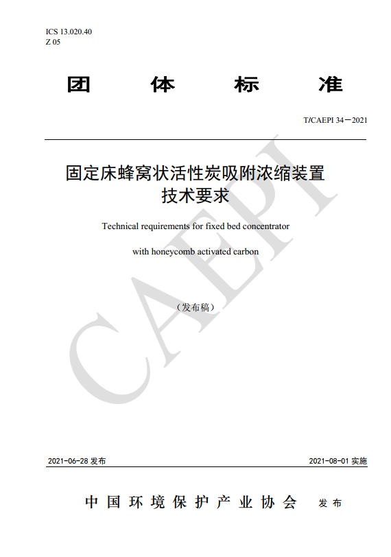 《固定床蜂窩狀活性炭吸附濃縮裝置技術(shù)要求》(T/CAEPI 34-2021)標(biāo)準(zhǔn)封面