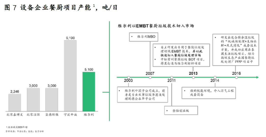 展望“十四五”,我們認(rèn)為有兩股力量不容忽視,餐廚垃圾處理行業(yè)真正激烈的市場競爭也許才剛剛開始,一方是以寧波開誠、維爾利為代表的企業(yè),他們進(jìn)入市場較早,主要提供技術(shù)或設(shè)備,同時具有一定的產(chǎn)能規(guī)模和先發(fā)品牌優(yōu)勢(見圖7)。