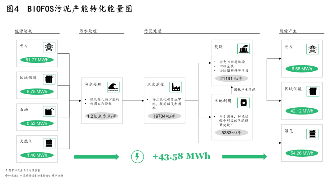 其二,30·60雙碳目標(biāo)提出后,未來污泥處理處置將以節(jié)能降耗及能源資源回收為目標(biāo),這對(duì)污泥處理提出了更為清晰的技術(shù)路徑方向。例如在能源回收上,厭氧消化是優(yōu)選途徑,如丹麥污水廠BIOFOS通過污泥消化產(chǎn)能實(shí)現(xiàn)能量盈余(見圖4)。