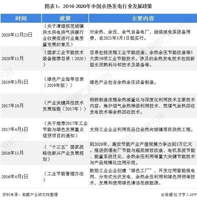 2020年發(fā)布的《關于清理規(guī)范城鎮(zhèn)供水供電供氣供暖行業(yè)收費促進行業(yè)高質量發(fā)展的意見》和《國家工業(yè)節(jié)能技術裝備推薦目錄(2020)》分別從費用減免與技術推薦的角度推動余熱發(fā)電行業(yè)發(fā)展。