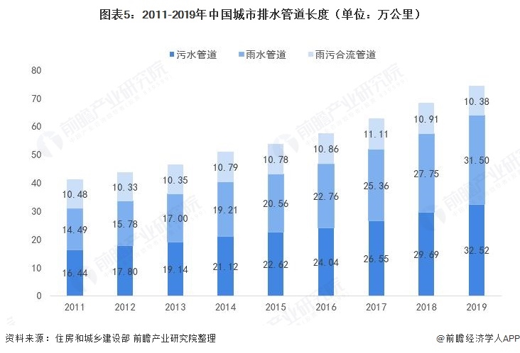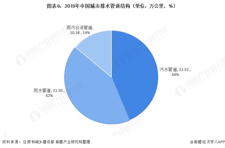 從我國(guó)城市排水系統(tǒng)的發(fā)展現(xiàn)狀來(lái)看,近年來(lái),我國(guó)城市排水管道長(zhǎng)度持續(xù)增長(zhǎng)。2019年,全國(guó)城市排水管道增加至74.40萬(wàn)公里,同比增長(zhǎng)8.85%。其中,污水管道和雨水管道分別為32.52和31.50萬(wàn)公里,占比為44%和42%;雨污合流管道為10.38萬(wàn)公里,占比為14%。