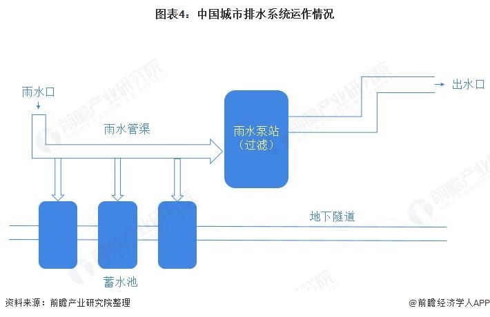 城市內(nèi)澇治理與完善城市排水系統(tǒng)密不可分。從城市排水系統(tǒng)運(yùn)作情況來(lái)看,首先,雨水會(huì)順著雨水口進(jìn)入雨水管渠,接著在雨水泵站過(guò)濾后,通過(guò)出水口流向湖泊或直接用于綠化澆灌等。如果遇到特大暴雨,管道也無(wú)法承載時(shí),雨水會(huì)進(jìn)一步分流至管道下方的隧道中,在降雨結(jié)束后送往污水處理廠進(jìn)行再次利用或排出到湖泊河流和人工水體中。
