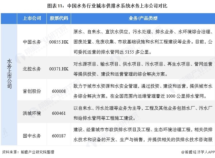 水務(wù)行業(yè)主要上市公司:目前水務(wù)行業(yè)的上市公司主要有中國(guó)水務(wù)(00855.HK)、北控水務(wù)(00371.HK)、首創(chuàng)股份(600008)、洪城環(huán)境(600461)等。