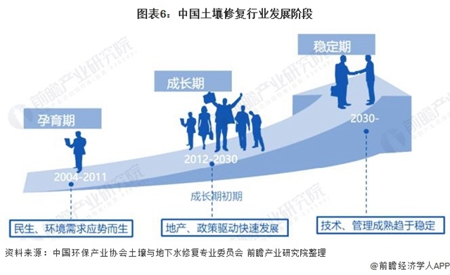 相較國外,國內(nèi)土壤及地下水修復(fù)行業(yè)相對國外而言起步較晚,大致劃分為三個(gè)階段—孕育期、成長期、穩(wěn)定期,我國土壤及地下水修復(fù)行業(yè)目前處于成長期。
