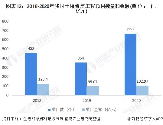 2020年全國正式啟動土壤修復(fù)工程項(xiàng)目668個(gè),總項(xiàng)目金額約為102.97億元,覆蓋全國除西藏、港澳臺以外的30個(gè)省(市、區(qū))。與2019年相比,項(xiàng)目金額增長8.31%,項(xiàng)目數(shù)量從354個(gè)項(xiàng)目增加到668個(gè)項(xiàng)目,數(shù)量增加非常明顯。近三年全國土壤修復(fù)工程市場總金額總體較為穩(wěn)定,近兩年基本維持在一百億元左右。
