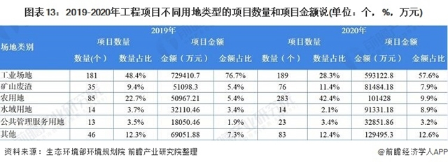 從土壤修復(fù)工程項(xiàng)目數(shù)量來看,2020年行業(yè)熱度持續(xù)增加,除水域用地類外,各類型工程類項(xiàng)目數(shù)量均有不同幅度的增加。從項(xiàng)目金額來看,2020年除工業(yè)場地項(xiàng)目總金額略有減少外,其他類型項(xiàng)目總金額均有不同幅度的增加。2020年,工業(yè)場地類土壤修復(fù)工程項(xiàng)目仍占據(jù)行業(yè)市場的主要份額,項(xiàng)目金額比重最大達(dá)到57.6%。