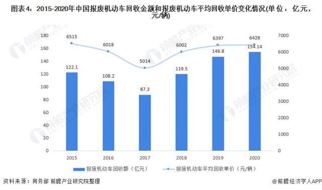 根據(jù)商務(wù)部發(fā)布的《中國再生資源回收行業(yè)發(fā)展報告(2020)》公布的數(shù)據(jù)顯示,預(yù)計2020年報廢機動車市場將呈現(xiàn)持續(xù)較快增長的良好態(tài)勢,增幅將在5%左右。通過每年商務(wù)部報告統(tǒng)計數(shù)據(jù)顯示,我國報廢機動車回收額2017年之后呈現(xiàn)較好的增長態(tài)勢,報廢機動車平均回收單價也呈現(xiàn)上升趨勢。2020年我國報廢機動車總額為154.14億元,每輛機動車平均處理單價為6428元。