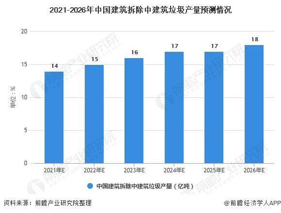 前瞻根據(jù)初步預(yù)測到2021年我國需要處理的建筑垃圾產(chǎn)量將達(dá)到32.09億噸,2026年,產(chǎn)量有望突破40億噸;若以35元/噸(運輸費與處置費)計算,預(yù)計2021年建筑垃圾處理市場規(guī)模將超過1400億元。