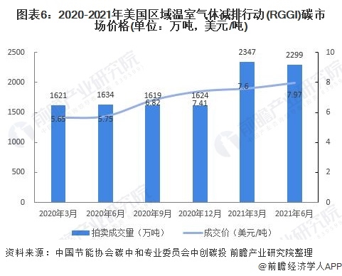 2020-2021年,美國(guó)RGGI碳市場(chǎng)價(jià)格呈上升趨勢(shì)。RGGI碳市場(chǎng)的初始配額發(fā)放以拍賣為主,每個(gè)季度舉行一次拍賣。2021年第一季度拍賣成交均價(jià)為$7.60美元,較上一季度漲幅為2.5%。由于弗吉尼亞州的加入,RGGI總成交量創(chuàng)歷史新高,達(dá)到了2347萬(wàn)噸。2021年第二季度,美國(guó)RGGI拍賣成交均價(jià)為7.97美元,較上一季度漲幅為4.9%,總成交量為2299萬(wàn)噸。