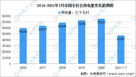 數(shù)據(jù)顯示,去年疫情影響基數(shù)低,2020年全社會(huì)用電量7.51萬億千瓦時(shí),同比增長3.1%。2021年1-7月,全社會(huì)用電量累計(jì)47097億千瓦時(shí),同比增長15.6%。