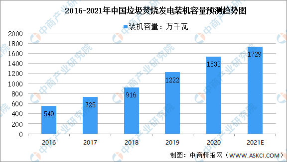 數(shù)據(jù)顯示,我國垃圾焚燒發(fā)電裝機(jī)容量由2016年549萬千瓦增至2020年1533萬千瓦,年均復(fù)合增長率為29.27%。中商產(chǎn)業(yè)研究院預(yù)測,2021年垃圾焚燒發(fā)電裝機(jī)容量可達(dá)1729萬千瓦。