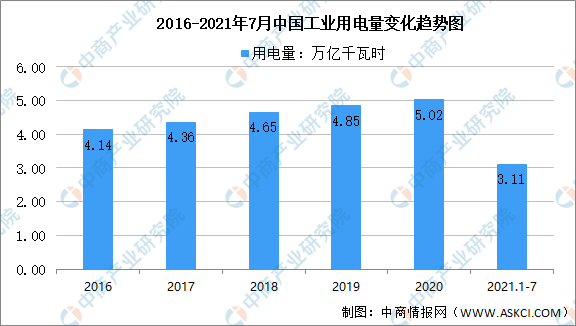 數(shù)據(jù)顯示,2021年1-7月,工業(yè)用電量達(dá)3.11萬億千瓦時(shí)。第一產(chǎn)業(yè)用電量102億千瓦時(shí),同比增長20.0%;第二產(chǎn)業(yè)用電量5068億千瓦時(shí),同比增長9.3%;第三產(chǎn)業(yè)用電量1422億千瓦時(shí),同比增長21.6%;其中,7月工業(yè)用電量達(dá)4972億千瓦時(shí)。