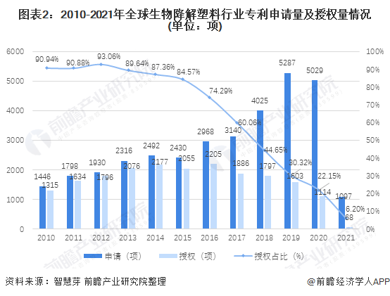 2021年1-8月,全球生物降解塑料行業(yè)專利申請數(shù)量和專利授權(quán)數(shù)量分別為1097項和68項,授權(quán)比重為6.20%。