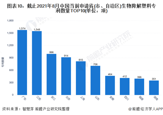 中國方面,廣東為中國當(dāng)前申請生物降解塑料專利數(shù)量最多的省份,累計當(dāng)前生物降解塑料專利申請數(shù)量高達(dá)1574項。廣東和江蘇當(dāng)前申請生物降解塑料專利數(shù)量均超過1500項。中國當(dāng)前申請省(市、自治區(qū))生物降解塑料專利數(shù)量排名前十的省份還有浙江、北京、上海、山東、安徽、四川、福建、湖南。