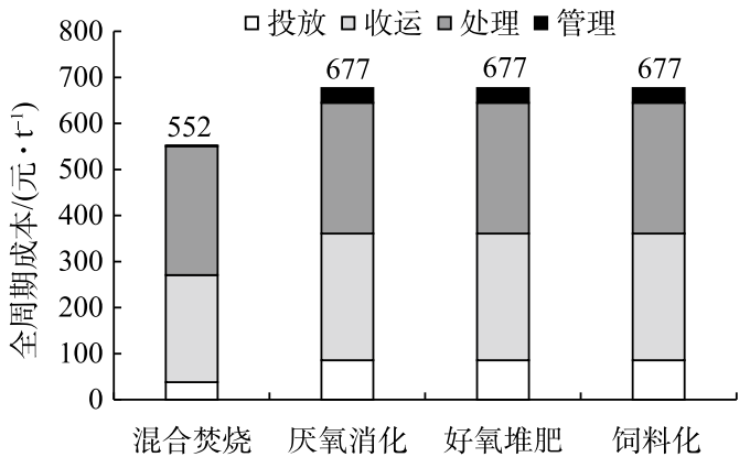 1. 廚余垃圾飼料化具有最高的回收利用率和顯著的碳減排效應(yīng);厭氧消化回收利用率較高,碳減排效應(yīng)最大;好氧堆肥的回收利用率與厭氧消化相當(dāng),但溫室氣體泄露會導(dǎo)致較高的碳排放;混合焚燒可以避免溫室氣體泄漏,但余熱發(fā)電的回收利用率較低,基本無碳減排效應(yīng)。