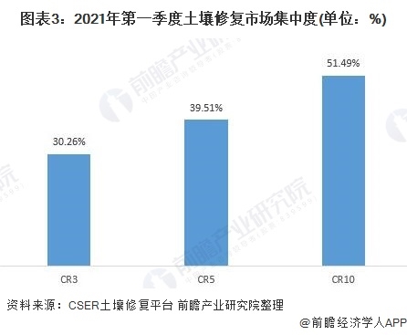 目前,中國土壤修復行業(yè)的市場集中度較低,競爭較為激烈。CSER土壤修復平臺數(shù)據(jù)顯示,2021年第一季度土壤修復項目中標金額前3的中標金額份額合計30.26%,排名前5的份額合計為39.51%,排名前5的份額合計為51.49%,市場集中度較高。