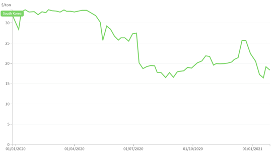 近兩年在韓國碳市場中,碳價持續(xù)處于波動狀態(tài)。2020年是韓國碳市場(K-ETS)運行第二階段的最后一年,受新冠疫情影響, 2020年的價格波動更加劇烈。碳價格在2020年4月初達到頂峰(35.92美元),然后從5月開始大幅下降至16.95美元,8月開始反彈至12月初達到25.84美元,12月末又有所回落(19.49美元)。2020年9月,韓國總統(tǒng)文在寅宣布將在2050年之前實現(xiàn)凈零排放的長期目標,預(yù)計將在未來幾年更新氣候政策框架,促進對低碳技術(shù)的投資。