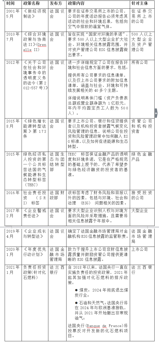 法國是全世界第一個將綠色金融納入法律范疇的國家。早在2001年,法國政府頒布新經(jīng)濟(jì)規(guī)制法案(NRE法案),啟動強(qiáng)制性財(cái)務(wù)外報(bào)告,要求上市公司披露其活動對環(huán)境和社會的影響。2010年的“Grenelle II 法案”第225條包含強(qiáng)制企業(yè)社會責(zé)任(CSR)信息披露的內(nèi)容,要求公司在年報(bào)中披露其環(huán)境及社會業(yè)績方面的信息。2012年,法國通過了關(guān)于公司在社會和環(huán)境事務(wù)中的透明度義務(wù)的法令(第2012-557號),進(jìn)一步詳細(xì)規(guī)定了公司在報(bào)告環(huán)境和社會信息方面的要求。對于法國金融界來說,《綠色增長能源轉(zhuǎn)型法案》173條是最具影響力的法案,明確要求上市公司、銀行和信貸提供者以及機(jī)構(gòu)投資者(資產(chǎn)所有者和投資經(jīng)理)提高氣候變化相關(guān)風(fēng)險(xiǎn)的披露與透明度,該法案還包括與氣候相關(guān)金融信息披露工作組(TCFD)密切相關(guān)的措施,并要求法國當(dāng)局評估銀行業(yè)與氣候相關(guān)的風(fēng)險(xiǎn),法國成為世界上第一個對金融機(jī)構(gòu)提出ESG信息披露要求的主要經(jīng)濟(jì)體。2015年,法國生態(tài)與團(tuán)結(jié)轉(zhuǎn)型部發(fā)布了綠色經(jīng)濟(jì)私人投資的第一個公共標(biāo)簽——法國的氣候能源和生態(tài)轉(zhuǎn)型標(biāo)簽(TEEC),TEEC標(biāo)簽確保了金融產(chǎn)品的透明性和環(huán)保性,它授予條件嚴(yán)格,代表了參與綠色經(jīng)濟(jì)融資的投資者的要求。2016年,法國財(cái)政部提出了社會責(zé)任投資(SRI)標(biāo)簽,該標(biāo)簽考慮了財(cái)務(wù)風(fēng)險(xiǎn)和回報(bào)以外的因素,包括與環(huán)境、社會和治理(ESG)問題相關(guān)的因素。2021年1月,法蘭西銀行針對自身投資發(fā)布了一項(xiàng)新的負(fù)責(zé)任投資政策,以加強(qiáng)其對化石燃料的排斥政策。據(jù)此,法蘭西銀行表示到2024年底,完全排除所有從事煤炭相關(guān)活動的公司,無論規(guī)模如何;2024年與歐洲基準(zhǔn)保持一致,2021年開始退出開始撤出非常規(guī)油氣;投票反對開發(fā)新的化石燃料項(xiàng)目。2021年3月,法蘭西銀行成立了氣候變化中心,以監(jiān)測其與氣候變化相關(guān)的所有舉措并確保其協(xié)調(diào)。