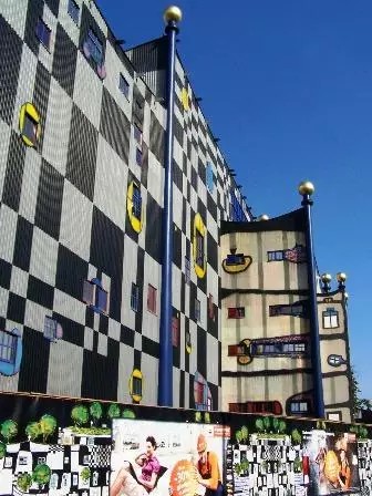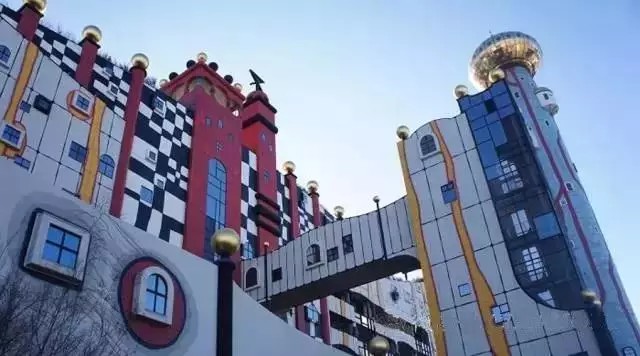 景觀設(shè)計(jì):這座建筑物是奧地利有名的藝術(shù)家、建筑設(shè)計(jì)師百水先生的杰作。工程從1988年至1992年進(jìn)行了四年建成。居民遠(yuǎn)遠(yuǎn)就可以看見一個(gè)高高聳立的大煙囪,中部有一個(gè)碩大的金色球體,在藍(lán)天下格外醒目。這金色的圓形球體會(huì)讓人聯(lián)想到某明珠電視塔的旋轉(zhuǎn)餐廳,其實(shí)不然。這就是垃圾焚燒廠的控制室。色彩斑斕而充滿童趣的外墻立面,讓人感覺就像是一座童話城堡。 外墻面上隨意涂抹的卡通畫,有的是各種色彩的水果,有的是各種性能的用具,煞是可愛。