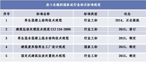 目前,建筑垃圾管理與資源化標(biāo)準(zhǔn)體系正在建設(shè)中,現(xiàn)有的建筑垃圾資源化利用及再生產(chǎn)品生產(chǎn)與應(yīng)用相關(guān)國家及行業(yè)標(biāo)準(zhǔn)規(guī)范有11項,在編的相關(guān)標(biāo)準(zhǔn)規(guī)范有5項(詳見表2、表3),其中強(qiáng)制性標(biāo)準(zhǔn)條文不多,在某種程度上制約了再生產(chǎn)品的生產(chǎn)、使用和推廣。