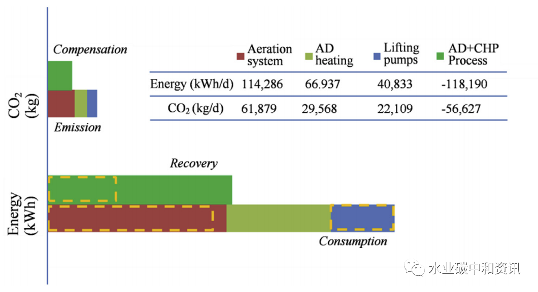 另一方面,污水中余溫?zé)崮芸梢酝ㄟ^水源熱泵轉(zhuǎn)化出熱量,以平衡能量赤字,甚至達(dá)到碳中和。一項(xiàng)關(guān)于污水處理廠(普遍COD = 200 ~ 400 mg/L)能量平衡評(píng)估表明,中國剩余污泥厭氧消化產(chǎn)甲烷只能彌補(bǔ)約50%的運(yùn)行能量消耗(Hao et al.)。進(jìn)一步研究表明,水源熱泵能夠有效轉(zhuǎn)化污水熱能,用以加熱污水處理廠及其周邊建筑,可提供約0.20 kWh·m-3·℃-1 凈電當(dāng)量。總的來說,中國有機(jī)物及熱能能夠有效供給充足的電當(dāng)量,足以達(dá)到碳中和運(yùn)行目標(biāo)。污水處理廠能耗及碳排放情況