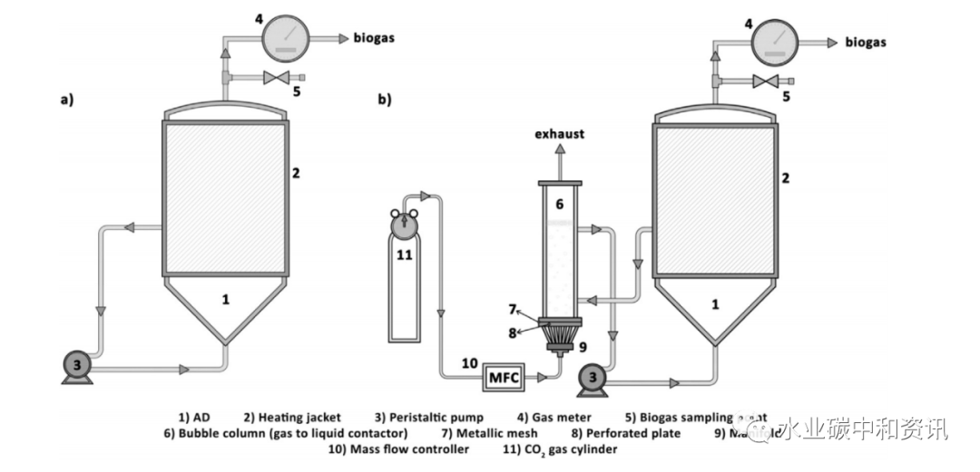如上所述,剩余污泥與外源固體/液體有機(jī)物共消化是實(shí)現(xiàn)碳中和的一種潛在途徑。而在厭氧消化中投加CO2也能刺激甲烷產(chǎn)生。一項(xiàng)小試研究證明,向厭氧消化池中投加濃縮有機(jī)廢物,適當(dāng)?shù)靥岣哂袡C(jī)負(fù)荷及縮短的停留時(shí)間,可以提高甲烷產(chǎn)量。因此,市政污水處理廠中可有效應(yīng)用熱電聯(lián)產(chǎn),以大大節(jié)省成本(Tandukar and Pavlostathis)。選擇口香糖制造廠和脫水脂肪油脂液產(chǎn)生的工業(yè)廢液作為外部有機(jī)物,與剩余污泥(初級(jí)﹕二級(jí)=40﹕60TS質(zhì)量比)共消化。結(jié)果顯示,沼氣產(chǎn)量明顯增加,剩余污泥額外降解1.1~30.7%。沼氣和甲烷產(chǎn)量都非常接近能夠彌補(bǔ)能量赤字之目標(biāo)水平。此外,共消化出水水質(zhì)與只投加剩余污泥控制組相近,說明共消化沒有負(fù)面影響。其它有機(jī)物與剩余污泥共消化機(jī)制相同。一項(xiàng)小試究以牛糞(MN)與外部有機(jī)廢物(食品廢物—FW、堿性水解液—AH和粗制甘油—GY)共消化與牛糞單獨(dú)消化對(duì)比(Usack and Angenent; Regueiro et al.);運(yùn)行900 d后,4組中溫平行共消化反應(yīng)器顯示出比甲烷產(chǎn)量(SMY)信息,與GY共消化最適宜總有機(jī)負(fù)荷率(OLR)為3.2 gVS/L·d(MN : GY = 62:38),最佳SMY為549±25 ml CH4/gVS;FW與AH共消化SMY數(shù)值相近(約300 ml CH4/gVS,對(duì)應(yīng)OLD =3.9 gVS/L·d,MN:FW = 51:49及OLD = 2.7 gVS/L·d,MN:AH=75:25)。眾所周知,CO2是在消化過程中伴隨著甲烷產(chǎn)生的產(chǎn)物。而另一方面,利用厭氧消化進(jìn)行CO2捕集固定是一種潛力十足的碳減排策略。兩個(gè)處理食品垃圾的厭氧消化試驗(yàn)進(jìn)行了225 d監(jiān)測,實(shí)驗(yàn)組定期使用氣泡柱充入CO2(Fernandez et al.)。實(shí)驗(yàn)組測試CH4產(chǎn)率為0.56±0.13 m3 CH4/kgVS·d(對(duì)照組為0.45±0.05 )沼氣中CH4濃度為68%,額外攝取了外源CO2 0.55 kg,H2濃度增加了2.5 倍,這歸因于CO2溶解以及酸化與產(chǎn)氫途徑改變。