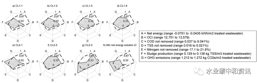 各類方案中可持續(xù)指標(biāo)評(píng)價(jià)一項(xiàng)以可持續(xù)碳中和運(yùn)行為目標(biāo)的積極分析表明,淹沒式厭氧膜生物反應(yīng)器(AnMBR)可能是凈能量明顯的,有利于形成碳負(fù)污水管理(Pretel et al.)。在該分析中,利用定量可持續(xù)設(shè)計(jì)過程,使用技術(shù)、環(huán)境和經(jīng)濟(jì)標(biāo)準(zhǔn)評(píng)估了全部可行的設(shè)計(jì)方案,來完善AnMBR詳細(xì)設(shè)計(jì)。其中,集成了跨季節(jié)溫度穩(wěn)態(tài)性能建模(使用中試實(shí)驗(yàn)數(shù)據(jù)和模擬軟 DESASS)、生命周期成本分析(LCC)和生命周期評(píng)價(jià)(LCA)。