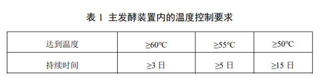 c)主發(fā)酵裝置內(nèi)的溫度及持續(xù)時間應(yīng)滿足表1的要求。采用密閉式堆肥反應(yīng)器時,宜在反應(yīng)器中心與距反應(yīng)器內(nèi)壁100 mm處各設(shè)2個測溫點,溫度按測溫點均值計,溫度需連續(xù)記錄。采用半密閉式和敞開條垛或槽式堆肥時,宜在條垛或槽式堆肥的長度方向每間隔5m橫截面的中心與距表面和底部100 mm處各設(shè)1個測溫點,溫度按測溫點均值計,間隔2小時記錄溫度1次。
