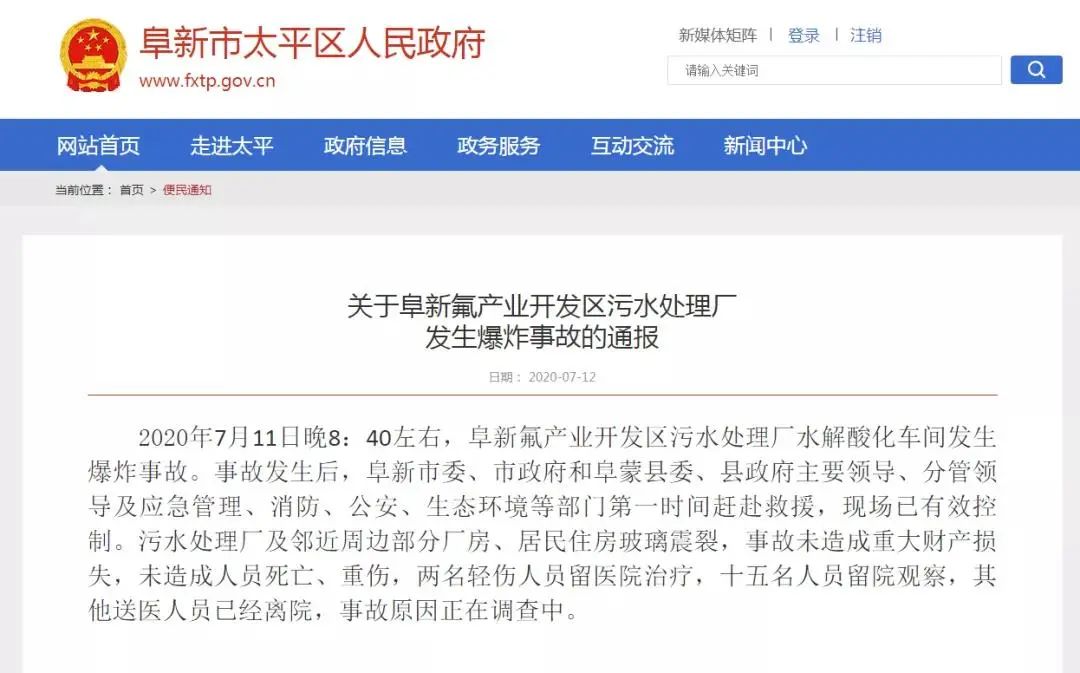 事故發(fā)生后,阜新市委、市政府和阜蒙縣委、縣政府主要領(lǐng)導、分管領(lǐng)導及應(yīng)急管理、消防、公安、生態(tài)環(huán)境等部門第一時間趕赴救援,現(xiàn)場已有效控制。污水處理廠及鄰近周邊部分廠房、居民住房玻璃震裂,事故未造成重大財產(chǎn)損失,未造成人員死亡、重傷,2名輕傷人員留醫(yī)院治療,15名人員留院觀察,其他送醫(yī)人員已經(jīng)離院,事故原因正在調(diào)查中。經(jīng)過調(diào)查,2020年9月28日,阜新市應(yīng)急管理局發(fā)布了《阜新氟產(chǎn)業(yè)開發(fā)區(qū)碧波污水處理廠“7.11”一般爆炸事故調(diào)查報告》,對事故的原因做出了認定。