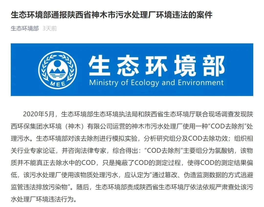 3、生態(tài)環(huán)境部通報陜西神木市污水處理廠使用“COD去除劑”環(huán)境違法案件,生態(tài)環(huán)境部,2021-01-23