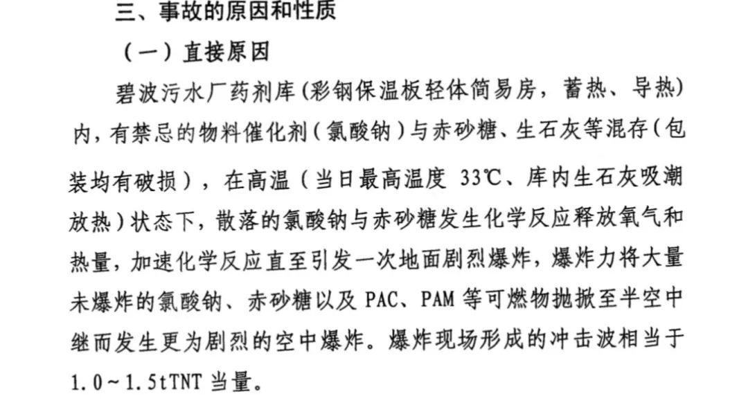 而之所以發(fā)生爆炸,正是與這些氯酸鈉有關(guān)。原來,碧波污水廠的藥劑庫為彩鋼保溫板輕體簡易房,容易蓄熱、導熱。由于里面儲存的氯酸鈉、赤砂糖、生石灰等化學品混存,且包裝均有破損。結(jié)果在高溫的狀態(tài)下,散落的氯酸鈉與赤砂糖發(fā)生化學反應(yīng),引發(fā)了第一次地面劇烈爆炸。