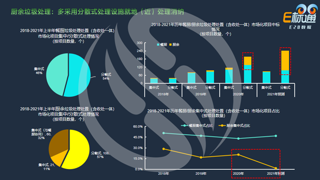 右上圖是歷年餐廚/廚余垃圾處理處置市場化項目不同處理方式的中標情況,通過2020年的數(shù)據(jù)以及2021年的預(yù)測可以得到,廚余垃圾采用分散式處理的市場化項目將會出現(xiàn)一個大幅釋放的過程,這和部分地方政府允許廚余垃圾壓榨后進入焚燒廠協(xié)同焚燒有關(guān)。結(jié)合右下圖(2018-2021年歷年餐廚/廚余集中式處理處置(含收處一體)市場化項目占比)亦可得出,預(yù)計今年,廚余垃圾采用分散式處理的項目會有一個顯著的增長。
